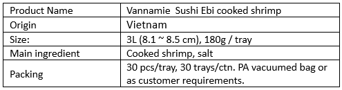 Product Name: Vannamei Sushi Ebi cooked shrimp, untreated, salt